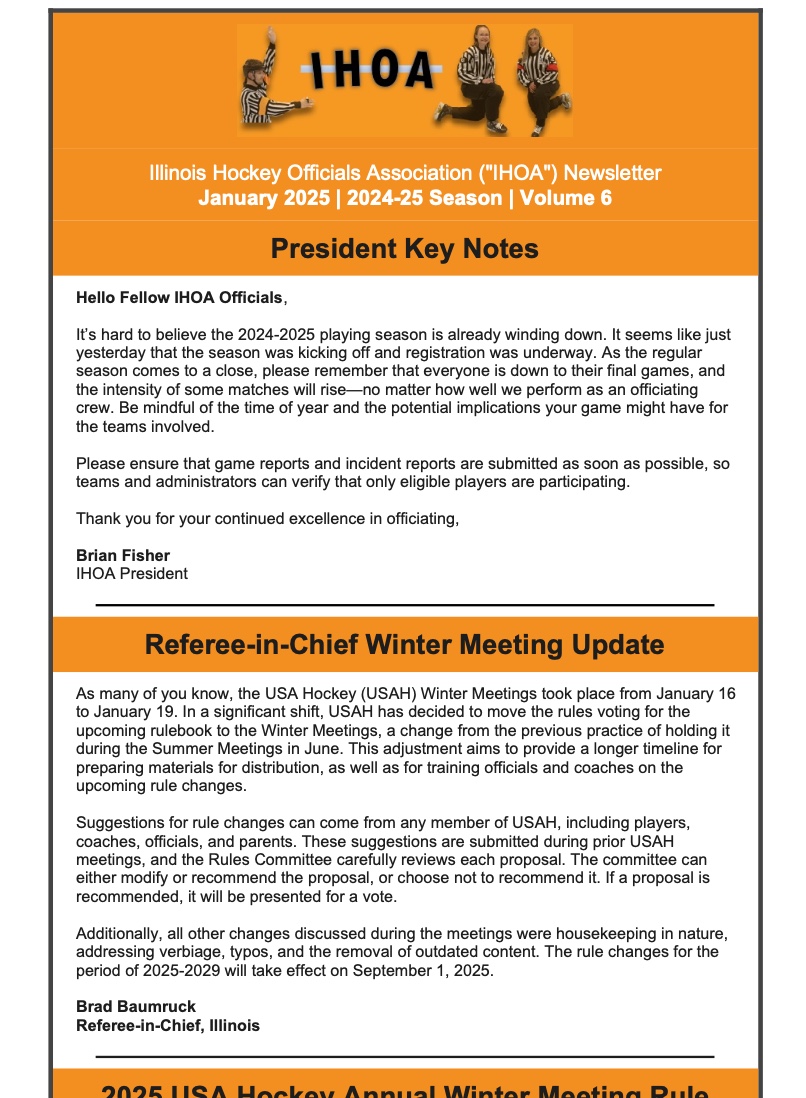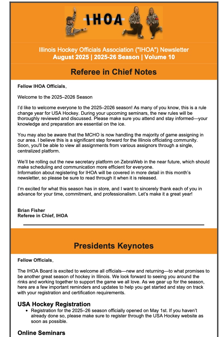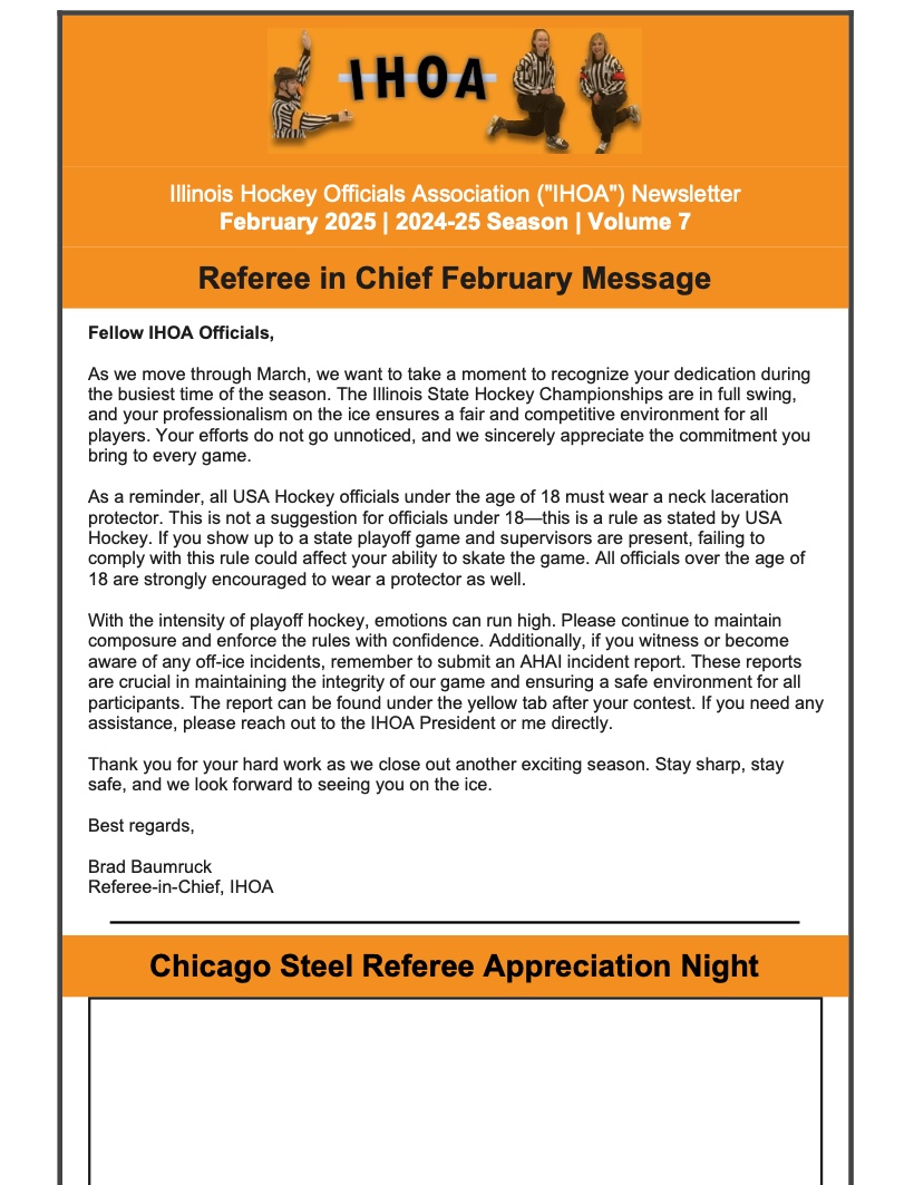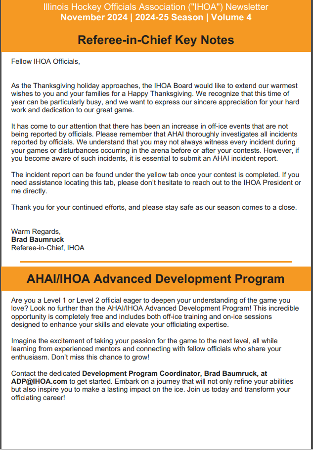 Currently, Scott serves as the Vice President of IHOA. He has previously served on the Rules and Ethics Committee and now contributes as the chairperson of the Communication Committee. In addition to supervising local games, he assists in conducting IHOA seminars. Scott is also the supervisor of officials for the USPHL Midwest Division and the ACHA Chicago Showcase, where he focuses on developing officials and helping them advance to minor professional and NCAA hockey.